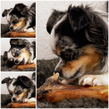 My name is Pina and I am 5 years old. I am a Chihuahua and one of the smallest dogs in the world. I have a very special coat colour called Merle. My owner ordered me a bone from Anifit so that I wouldn't chew on his shoes any more. The bone tastes very good to me. But I have a lot of work to do, the bone is now almost bigger than me. When the weather is nice, I can run around our garden without a lead and enjoy my chewing pleasure.